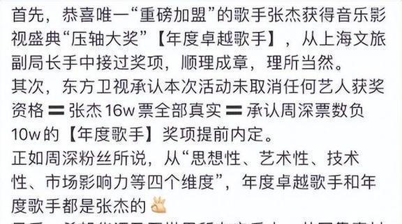 当时俩人都参加了同一个音乐评选,结果最大的奖给了周深,张杰就拿了个不起眼的小奖。这下粉丝可不干了,不光把主办方东方卫视骂了一顿,连周深本人都跟着遭殃,被这群“热情过头”的粉丝追着喷。